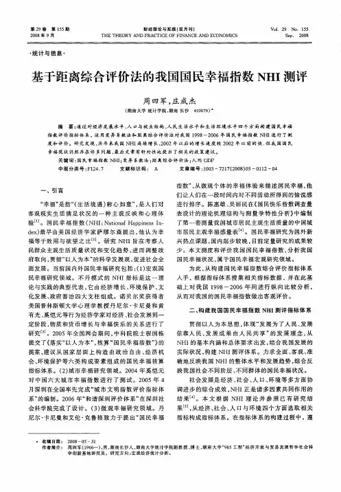 城乡居民幸福指数调查随着中国经济的发展,人民生活的不断提高,我们的生活幸福指数会是多少呢?幸福指数如今日益成为了国民生活状况提高的标准,为了了解城乡居民的幸福指数,特作此调查,真诚感谢你的参与!1、您来自()A、农村B、城市2、您认为如今生活状况幸福值高吗?()A、高B、不高C、一般3、您认为如今生活状况幸福值高吗?()A、城市B、农村4、作为城镇(农村)居民,您认为如今生活状况幸福值高吗?()A、高B、不高C、一般5、你认为月收入多少以上才算是幸福呢?()A、1000-2000B、2000-3000C、3000以上6、理想与现实的冲突会让你感到困惑吗?A、有,非常大B、有一点点C、没有,因为很正常7、你对自己的身形容貌是否满意?A、非常满意B、不怎么满意C、还可以8、你有追求的生活目标吗?A、有、很明确B、有、但不名确C、暂时没有D、随遇而安9、你对现在的生活满意吗?A、非常满意B、还算满意C、不太满意D、很不满意10、你的家庭状况如何?A、不和谐B、较和谐,偶有争吵C、美满和谐11、你跟家人在一起感觉如何?A、很幸福B、还算幸福C、不太幸福D、很不幸福12、你认为你在朋友或亲人心目中的形象是怎样的?A、活泼开朗B、沉默寡言C、睿智聪颖D、温文尔雅E、大大咧咧13、你对你的家庭经济状况持什么态度?A、乐观B、无所谓C、忧虑D、悲观14、你觉得幸福的人应具备哪些特点?A、自信乐观B、开朗C、人际关系好、D、聪慧、E、自由、F、有追求G、心态平和H、自我接纳I创造性J、努力奋斗15、你认为一下哪些因素有可能增加你的幸福感?A、稳定的社会局势B、健康的心理C、舒适的居住环境D、个人的发展前景很好E、家庭和睦能 F 、实现自我价值G、良好的工作环境 H、丰厚的收入 I、融洽的人际关系系别:理学系;年级:09级;专业: 数学与应用数学班级:数学2班;学号:092014020064 ;姓名:杨廷洋实践单位:实践时间:2012年6月14日到2012年6月17日共3天《关于城乡幸福指数的调查报告》前言:什么是幸福?到目前为止,世界上已有数以万计有关于幸福的表述。