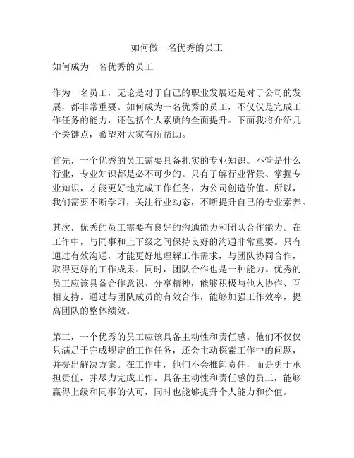 如何成为一个优秀的员工如何成为一个优秀的员工如何成为一个优秀的员工篇11、优秀员工做事要认真,态度要端正,要脚踏实地,要悉心听取领导的安排,要有自己的主见;2、要有敬业的精神。