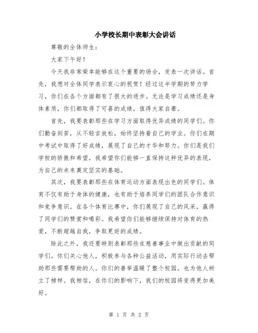 小学校长期中表彰大会讲话尊敬的全体师生:大家下午好!今天我非常荣幸能够在这个重要的场合,发表一次讲话。