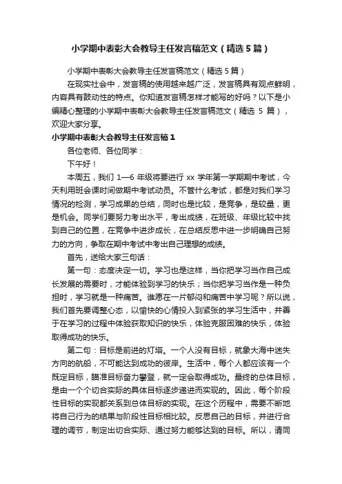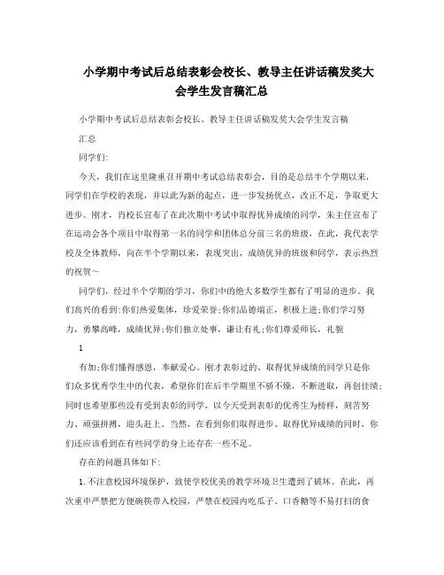 小学期中考试教导主任发言稿篇1各位老师,各位同学:大家好!今天,学校召开期中考试总结表彰大会。