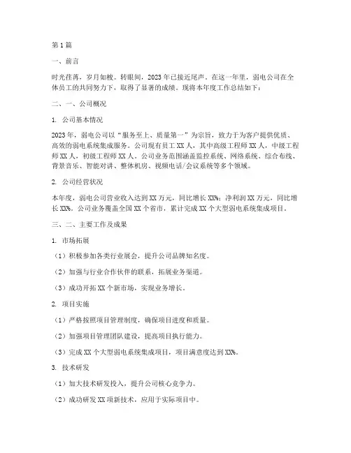 现将本年度工作总结如下:二、一、公司概况1. 公司基本情况2023年,弱电公司以“服务至上、质量第一”为宗旨,致力于为客户提供优质、高效的弱电系统集成服务。