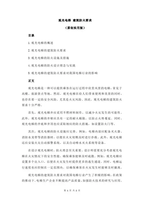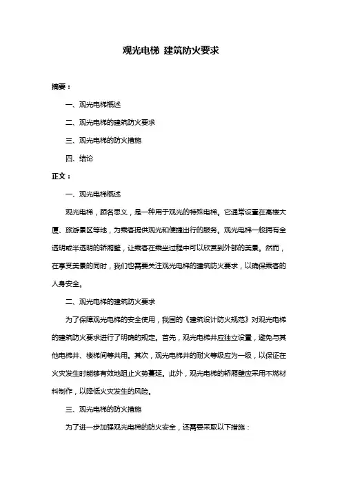 观光电梯建筑防火要求1. 引言观光电梯是一种独特的建筑设施,它不仅具备传统电梯的功能,还能提供观光和景观欣赏的体验。