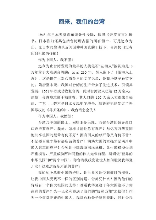 可是迄今为止,在日本的煽动以及美国种种因素的干扰下,台湾仍旧没有回到祖国的怀抱!作为中国人,我不服!迄今为止台湾发现的最早的人类化石“左镇人”被认为是3万年前于大陆到台湾的;公元230年,吴人留下了《临海水土志》,这是世界上对台湾最早的文字记录,是我华夏子孙留下的;隋唐至宋元,我国对台湾的生产带来了先进技术,引领其发展;1661年郑成功收复台湾,此时台湾汉人已达12万余人;清朝,台湾被隶属于福建省,其人口的100万余人大都来自福建、广东……若不是日本发起甲午战争,清政府无能签订了丧国辱权的《马关条约》,我台湾怎会失?作为中国人,我愤怒!台湾乃中国的国土,回归本是正理,而你台湾的领导却口口声声要尊严,我问:怎样才能让你有尊严?与亿万万华夏同胞共享祖国的繁荣有何不好?拥有国人的尊严你又有何不甘?不是要台独才能有那所谓的尊严!泱泱大国的富强才是两岸中国人共享的尊严!台独让中国海防出现危机,让中国权益受到严重损害,严重威胁两岸同胞的伟大光荣前程,所谓做“世界的中华民国”和“两个中国”,你台湾执政党让世人如何耻笑我华夏儿女?这难道就是所谓的尊严?我们如今拿着中国的护照,让世界各地受到仰目的摧崇,让我中国人受到不一样的区别待遇,借问凭什么?因为他们的背后有一个伟大祖国的支持!难道我华夏这千年大国给不了你该有的尊严?为一己私利葬送了我们的“协和万邦”之信仰!作为一个堂堂正正的中国人,我对台独分子感到羞耻,同时令我愤怒!作为一个中国人,我相信。