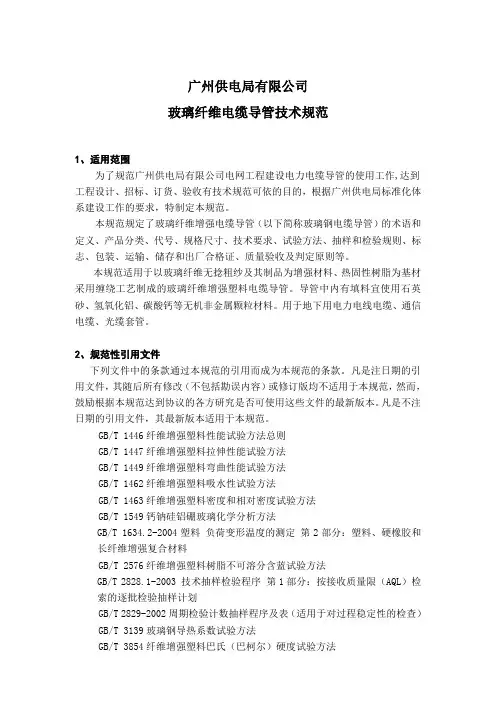广州供电局有限公司玻璃纤维电缆导管技术规范1、适用范围为了规范广州供电局有限公司电网工程建设电力电缆导管的使用工作,达到工程设计、招标、订货、验收有技术规范可依的目的,根据广州供电局标准化体系建设工作的要求,特制定本规范。