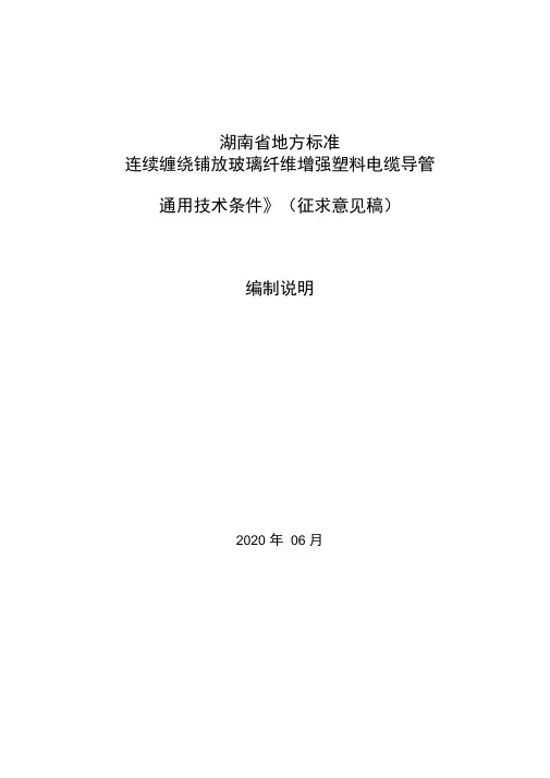 湖南省地方标准《连续缠绕铺放玻璃纤维增强塑料电缆导管通用技术条件》(征求意见稿)编制说明2020年06月《连续缠绕铺放玻璃纤维增强塑料电缆导管通用技术条件》(征求意见稿)编制说明一、工作简况(一)任务来源本项目由国网湖南省电力有限公司电力科学研究院、湖南省产商品质量监督检验研究院等单位,向湖南省市场监督管理局申请。