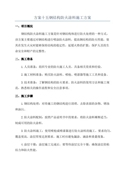 钢结构防火涂料施工方案1. 前言钢结构的轻质、高强度、易于加工造型、绿色环保等特点,使其在建筑、制造业、航空航天等领域得到广泛应用。