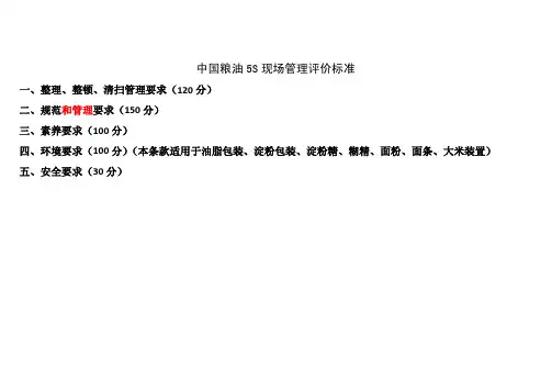 《中国粮油生产管理评价标准》以创建以成本控制为核心的现代化企业为指导思想,以中国粮油《工艺管理制度编制大纲》、《中国粮油技术规程编制大纲》、《设备管理制度编制大纲》、《中国粮油TPM实施指南》和《中国粮油5S实施指南》为核心依据,体现全员、全过程管理,突出重点、核心和要害部位的内容和专业技术,实现定检查内容、定检查评定标准、定检查评比参数,量化检查结果。