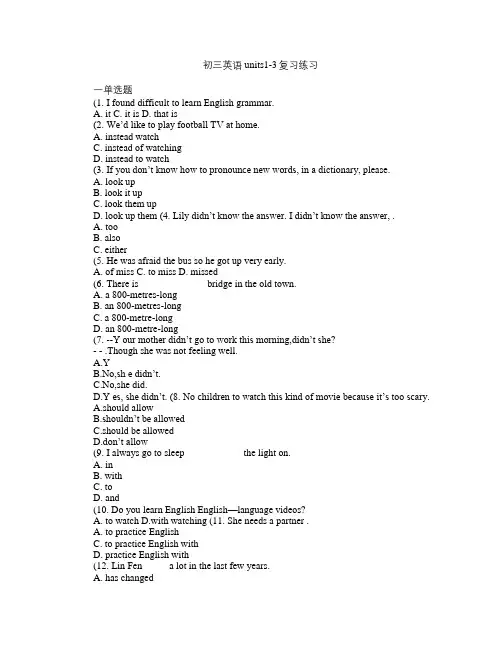 初三英语units1-3复习练习一单选题(1. I found difficult to learn English grammar.A. it C. it is D. that is(2. We’d like to play football TV at home.A. instead watchC. instead of watchingD. instead to watch(3. If you don’t know how to pronounce new words, in a d ictionary, please.A. look upB. look it upC. look them upD. look up them (4. Lily didn’t know the answer. I didn’t know the answer, .A. tooB. alsoC. either(5. He was afraid the bus so he got up very early.A. of miss C. to miss D. missed(6. There is _____________ bridge in the old town.A. a 800-metres-longB. an 800-metres-longC. a 800-metre-longD. an 800-metre-long(7. --Y our mother didn’t go to work this morning,didn’t she?- - .Though she was not feeling well.A.YB.No,sh e didn’t.C.No,she did.D.Y es, she didn’t. (8. No children to watch this kind of movie because it’s too scary.A.should allowB.shouldn’t be allowedC.should be allowedD.don’t allow(9. I always go to sleep ___________ the light on.A. inB. withC. toD. and(10. Do you learn English English—language videos?A. to watch D.with watching (11. She needs a partner .A. to practice EnglishC. to practice English withD. practice English with(12. Lin Fen _____a lot in the last few years.A. has changedB. changesC. is changingD. has change (13. --They have a lot of strict rules at home. ---_____ .A. So we have.B.So do we.C. So I have.D. So we do (14. I have to stay at home ______ school nights.A. inB. atC. onD. for(15. --John didn’t pass the test this time, did him? -- .Hefailed again. A. Y es, he did.B. No, he didn’tC. Y es, he was ’t ( 16. The old people must______________.A.be taken good care ofB.take good care ofC.be taken good careD.take good care( 17. I ___________ yesterday. It was broken.A. had my bike repairB. had my bike repairsC. had my bike repairedD. has my bike repaired( 18. the help of my classmates, I’ve improved my English.A C Under D For( 19. -Do you like the skirt ? -It _______ soft.A. is feelingB. feltC. feelsD. is felt( 20.Did you play the computer games?A used to C. usedn’t to D use( 21.I like tests, but now I like them very much.A didn’t used to C didn’t use to D used to not ( 22. _____ middle school students allowed to use mobile phone at school?A. DoB. DidC. AreD. Can( 23. too much is bad for your health.B. EatC. T o eatingD. Eatting ( 24. __ is really hard __ them to climb Mount Tai.A. This, toB. It, forC. This, forD. It, to( 25. Y ou never go to the movies, ________?A. don't youB. do youC. won't youD. can't you二用所给词的正确形式填空。