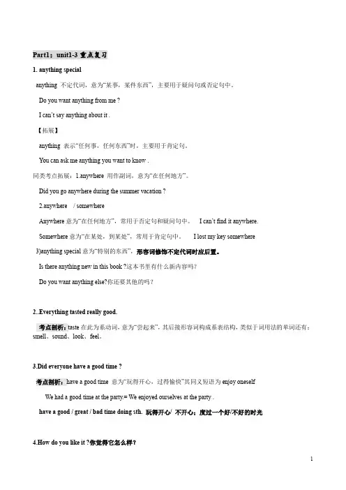 Part1:unit1-3重点复习1. anything specialanything 不定代词,意为“某事,某件东西”,主要用于疑问句或否定句中。