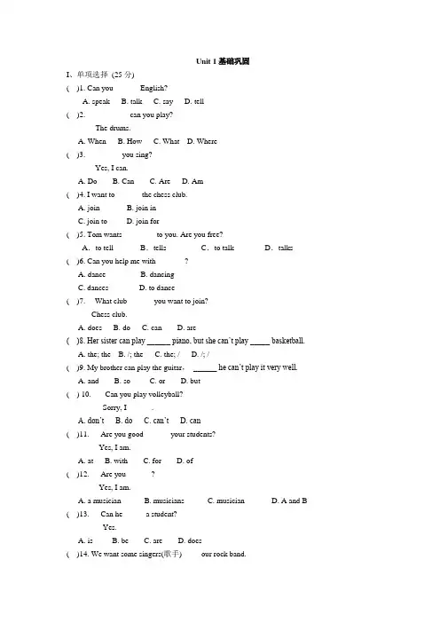 Unit 1基础巩固I、单项选择(25分)( )1. Can you ______ English?A. speakB. talkC. sayD. tell( )2. --- ________ can you play?--- The drums.A. WhenB. HowC. WhatD. Where( )3. --- ______ you sing?--- Yes, I can.A. DoB. CanC. AreD. Am( )4. I want to ______ the chess club.A. joinB. join inC. join toD. join for( )5. Tom wants ________ to you. Are you free?A.to tell B.tells C.to talk D.talks ( )6. Can you help me with _______?A. danceB. dancingC. dancesD. to dance( )7. ---What club ______ you want to join?--- Chess club.A. doesB. doC. canD. are( )8. Her sister can play ______ piano, but she can‘t play _____ basketball.A. the; theB. /; theC. the; /D. /; /( )9. My brother can play the guitar,______ he can‘t play it very well.A. andB. soC. orD. but( ) 10. ---- Can you play volleyball?--- Sorry, I ______.A. don‘tB. doC. can‘tD. can( )11. --- Are you good ______ your students?--- Yes, I am.A. atB. withC. forD. of( )12. --- Are you ______?--- Yes, I am.A. a musicianB. musiciansC. musicianD. A and B ( )13. --- Can he _____ a student?--- Yes.A. isB. beC. areD. does( )14. We want some singers(歌手) ____ our rock band.A. forB. ofC. toD. at( )15. My brother _______ the trumpet and he play it _____ .A. can plays, goodB. can‘t play, goodC. can play, wellD. doesn‘t play, well( )16.Can you paint? ________.A.Yes, a little B.Yes, little C.No, a little D.No, little( )17.Please call me ________ 8989766.A.in B.at C.about D.with( )18.________ like to go swimming ________ summer.A.Children, on B.Children, in C.A child, on D.A child, in ( )19. Can you help me ________ my English?A.with B.of C.learning D.about( )20.What can you do, Lin Tao? ________.A.I like sports B.I want to join the music clubC.I am well D.I can do Chinese Kung Fu( )21.Hi, can I help you? ________.A.Yes, please B.No, I can‘t C.Yes, I can D.You are welcome( )22.________ you can ________ our school concert.A.Maybe, in B.Maybe, be inC.May be, in D.May be, be in( )23.We want two good ________ our rock band.A.music for B.musician in C.music in D.musicians for( )24.Little Tom can draw ________.His drawings are very ________.A.good, well B.well, good C.good, good D.well, well( )25.Can he ________ it in English?A.speak B.speaks C.say D, talkII、口语运用(10分)A、对话排序根据对话逻辑关系,排列下列句子为一段通顺的对话。
