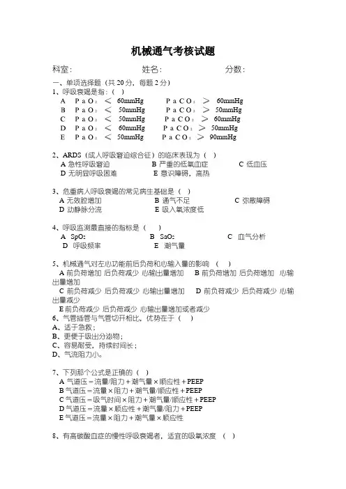 机械通气考核试题(一)2017-11-14科室:姓名:分数:一、单项选择题(共20分,每题2分)1、呼吸衰竭是指:(D)APaO2≤ 60mmHg PaCO2≥60mmHgBPaO2≤50mmHg PaCO2≥ 50mmHgCPaO2≤50mmHg PaCO2≥ 60mmHgDPaO2≤60mmHg PaCO2≥ 50mmHgEPaO2≤ 50mmHg PaCO2≥ 90mmHg2、ARDS(成人呼吸窘迫综合征)的临床表现为(A)A 急性呼吸窘迫B 严重的低氧血症C 低血压D 无明显呼吸困难E 意识障碍,高热3、危重病人呼吸衰竭的常见病生基础是(B)A 无效腔增加B 通气不足C 弥散障碍D 动静脉分流E 吸入氧浓度低4、呼吸监测最直接的指标是( C)A SpO2 B SaO2C 血气分析D 呼吸频率E 潮气量5、机械通气对左心功能前后负荷和心输入量的影响(E)A前负荷增加后负荷减少心输出量增加 B前负荷增加后负荷增加心输出量增加C前负荷减少后负荷减少心输出量增加 D前负荷减少后负荷减少心输出量减少E前负荷减少后负荷减少心输出量增加或者减少6、气管插管与气管切开相比,优势在于( A )A、适于急救;B、更便于吸出分泌物;C、容易耐受,持续时间长;D、气流阻力小。