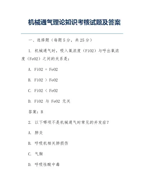 机械通气理论知识考核试题及答案一、选择题(每题5分,共25分)1. 机械通气时,吸入氧浓度(FiO2)与呼出氧浓度(FeO2)之间的关系是:A. FiO2 = FeO2B. FiO2 > FeO2C. FiO2 < FeO2D. FiO2 与 FeO2 无关答案:B2. 以下哪项不是机械通气时常见的并发症?A. 肺炎B. 呼吸机相关肺损伤C. 气胸D. 呼吸性酸中毒答案:D3. 下列关于潮气量的描述,哪项是错误的?A. 潮气量是指每次呼吸时吸入或呼出的气体量B. 潮气量受呼吸频率和每次呼吸的深度影响C. 潮气量与患者的年龄、性别和体重无关D. 机械通气时,潮气量通常设定为8-10ml/kg答案:C4. 以下哪种情况下,应考虑进行机械通气?A. 慢性阻塞性肺疾病急性加重B. 肺炎C. 心脏骤停D. 轻度呼吸困难答案:A5. 机械通气时,以下哪种模式不是常见的通气模式?A. 控制通气B. 辅助通气C. 持续正压通气D. 间歇正压通气答案:D二、填空题(每题5分,共25分)6. 机械通气时,_______是指呼吸机提供的气流速率,通常以每分钟升为单位表示。