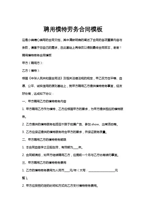 第一条定义1.1 “甲方”指甲方(雇主):________________1.2 “乙方”指乙方(模特):________________1.3 “模特工作”指甲方委托乙方从事的各类模特活动,包括但不限于平面广告、电视广告、活动表演、展示展览等。