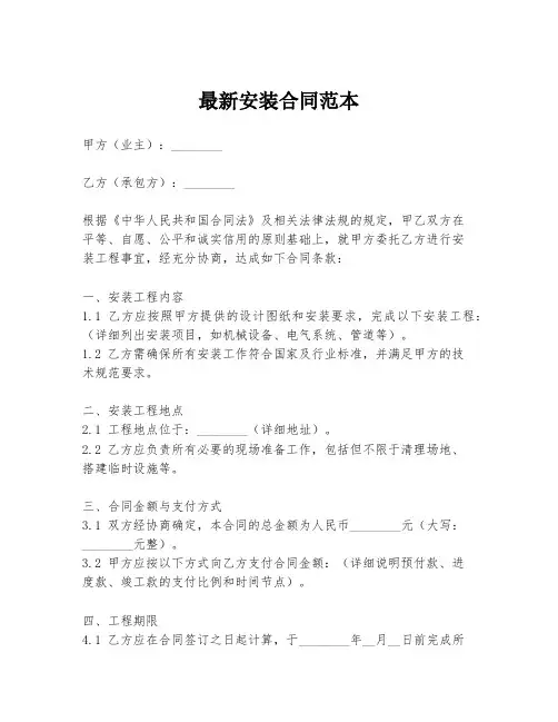 新工程安装合同范本合同编号: [编号]甲方(委托方): [甲方名称]地址: [甲方地址]联系人: [联系人姓名]电话: [联系电话]乙方(承包方): [乙方名称]地址: [乙方地址]联系人: [联系人姓名]电话: [联系电话]鉴于甲方拟进行新工程的安装,并希望委托乙方进行相关工作,双方经协商一致,达成以下合同:一、工程内容1. 甲方委托乙方进行 [工程内容] 的安装工作,具体内容详见附件《工程安装清单》。