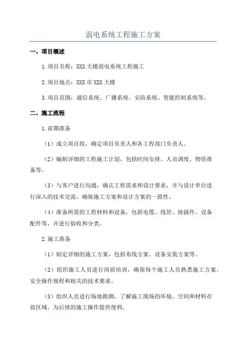 弱电系统工程施工方案一、项目概述1.项目名称:XXX大楼弱电系统工程施工2.项目地点:XXX市XXX大楼3.项目范围:通信系统、广播系统、安防系统、智能控制系统等。
