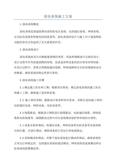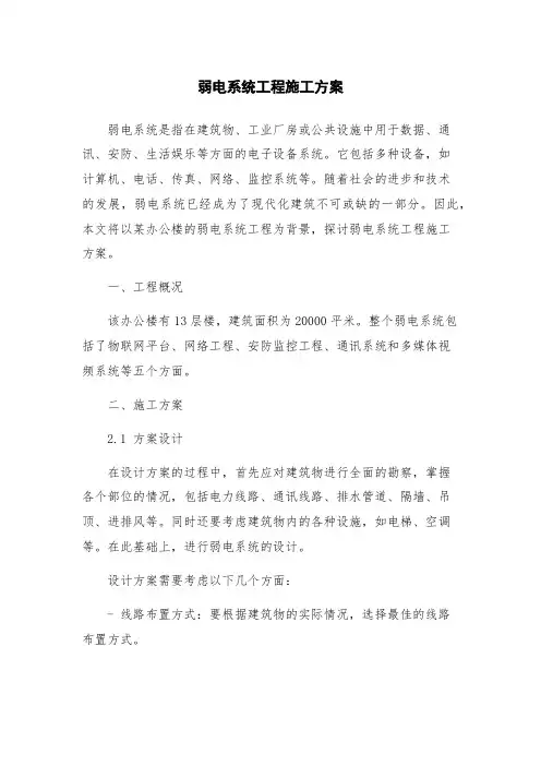 方案的格式和要求是什么样的呢?以下是小编为大家整理的弱电工程施工方案,仅供参考,欢迎大家阅读。
