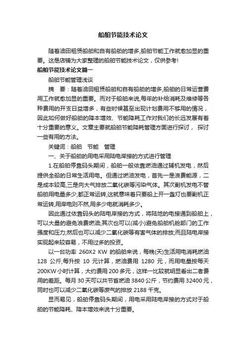 这是店铺为大家整理的船舶节能技术论文,仅供参考!船舶节能技术论文篇一船舶节能管理浅谈摘要:随着油田租赁船舶和自有船舶的增多,船舶的日常运营费用工作就愈加显的重要。