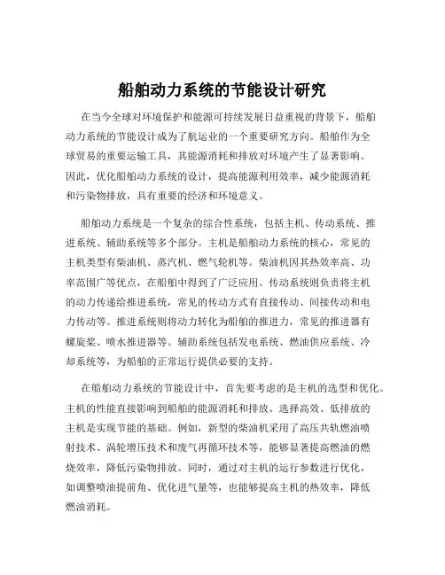 一、船舶动力系统的节能技术研究1. 优化船体设计:通过改进船体形状、减少阻力,使航行过程中的能耗减少。