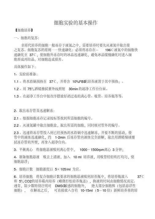 细胞培养相关实验1、复苏细胞步骤:从-80℃冰箱或者-196℃液氮罐中取出细胞(握手心),快速放在37℃水浴箱(提前预热至37℃)轻轻摇晃至变成溶液。