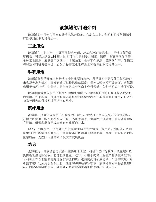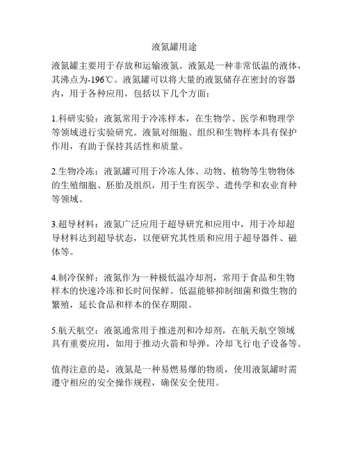液氮罐使用方法说明书1. 概述液氮罐是一种用于储存液态氮的设备,主要应用于科研、医疗等领域。