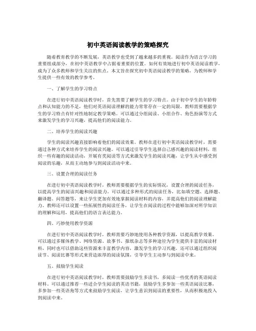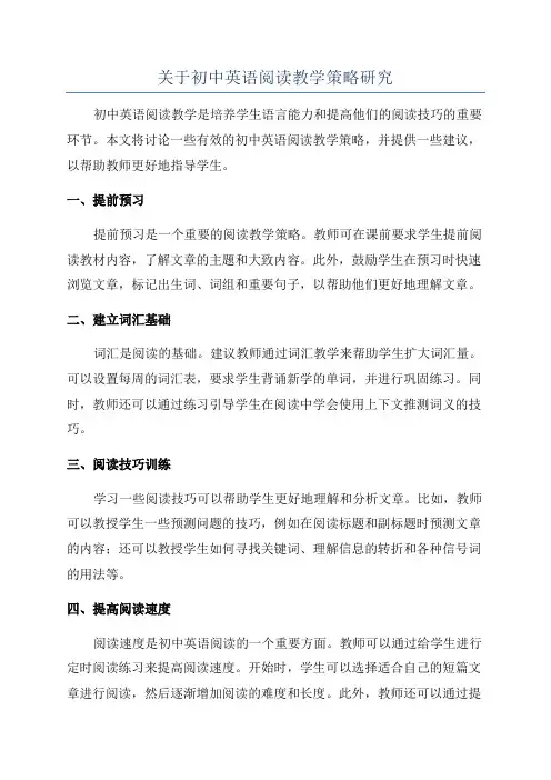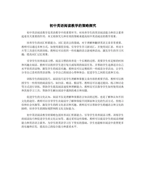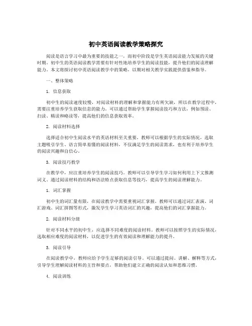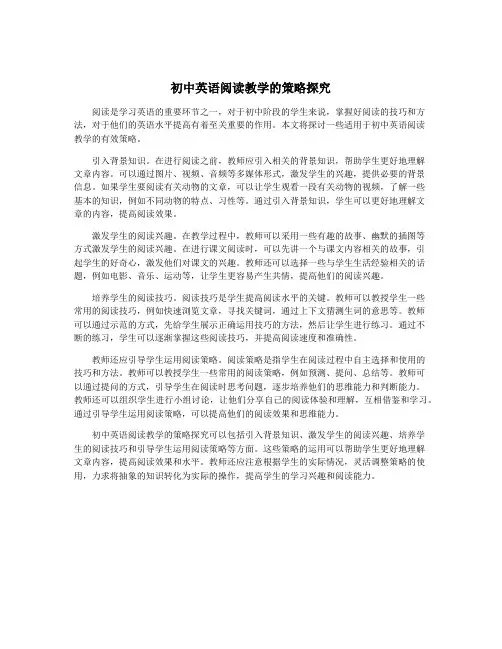 初中英语阅读教学的策略探究可以包括引入背景知识、激发学生的阅读兴趣、培养学生的阅读技巧和引导学生运用阅读策略等方面。