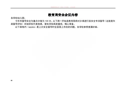 教育局安全会议内容各学校幼儿园:今年市督导安全为重点分值为100分,从下周一开始县教育局将对乡镇进行县安全专项督导(这就是年底督导评估)所抽学校代表我镇。