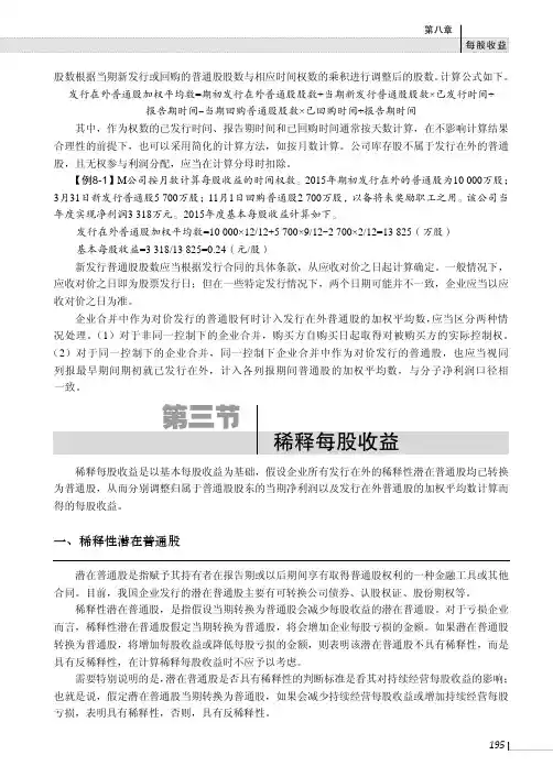 第八章每股收益股数根据当期新发行或回购的普通股股数与相应时间权数的乘积进行调整后的股数。