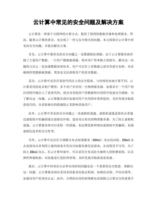 一、云计算的安全问题1. 数据的隐私泄露在云计算中,用户的数据存储在云服务提供商的服务器上,而用户无法直接掌控这些服务器。