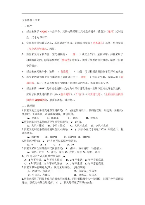 A、蓝色、红色B、蓝色、绿色C、红色、绿色D、绿色、蓝色6.一汽-大众对产品的防腐性承诺是 AA、3年不生锈,12年不穿孔腐蚀B、2年不生锈,11年不穿孔腐蚀C、3年不生锈,11年不穿孔腐蚀D、2年不生锈,12年不穿孔腐蚀7.新宝来多功能钥匙为( B ),悦动采用的是( )遥控钥匙。