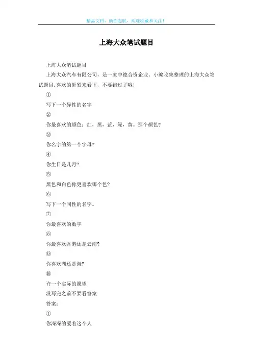 小编收集整理的上海大众笔试题目,喜欢的赶紧来看下,不要错过了哦!①写下一个异性的名字②你最喜欢的颜色:红,黑,蓝,绿,黄。