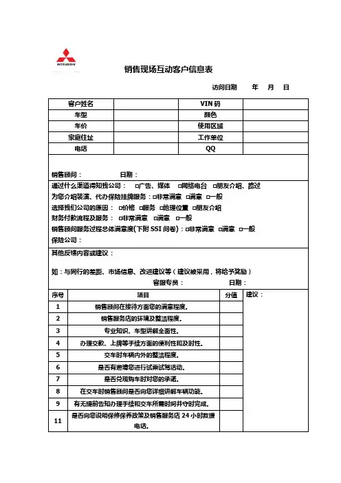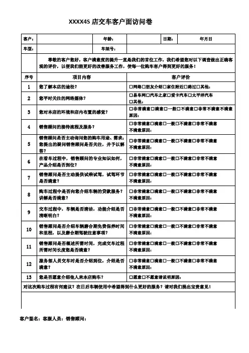 第二篇:汽车4S店客户满意度调查来店客户满意度调查尊敬的顾客:您好!欢迎您光临***汽车经销店,在您看车、选车、购车的期间,为了能够给您提供真正的购买喜悦之旅,请您协助我们对给您提供服务的工作人员的服务做出您的评价及打分,非常感谢!1.当您来店的第一时间,是否有工作人员热情的接待您,咨询您的到店意向?您对我们的接待是否满意?□ 是□ 否/ □ 较差□ 满意□ 非常满意 2.销售顾顾问是否向您递上名片,在您进店时,能进行简短的自我介绍,并请教您的称呼?□ 是□ 否/ □ 较差□ 满意□ 非常满意 3.销售顾问请您坐下洽谈时,是否第一时间为您奉上可供选择的免费饮料?□ 是□ 否/ □ 较差□ 满意□ 非常满意 4.销售顾问是否对您想要了解的产品的配置、产品性能作了专业详细的介绍?□ 是□ 否/ □ 较差□ 满意□ 非常满意 5.销售顾问是否主动邀请您试乘试驾,并在试驾途中提示您安全驾驶的要点并提供让您满意的服务?□ 是□ 否/ □ 较差□ 满意□ 非常满意 6.销售顾问在接待您时是否热情专注的给您提供服务,如遇其他事务需处理,是否向您致歉后再离开?□ 是□ 否/ □ 较差□ 满意□ 非常满意 7.在您下次光临时,是否还希望本次接待您的销售顾问为您提供服务?□ 是□ 否如不是,请简单说明,我们会马上进行改善,为您提供更好的服务:顾客姓名:销售顾问:购车用户满意度调查问卷感谢您选择在我店购买您的爱车,请您继续协助我们填写以下的问卷,为了给您提供更优质的服务,请您如实填写购车时的感想和意见,为表示谢意,我们将赠送您一份有广本标志的精美小礼品!1)在您给店里打来电话时,能听到销售人员报上自己特约店名称及自己的姓名吗?□ 是□ 否/ □ 较差□ 满意□ 非常满意 2)在您不清楚来店路线时,能给您明确的指引吗?并在电话结束时感谢您的来电吗?□ 是□ 否 / □ 较差□ 满意□ 非常满意 3)在您离开展厅时,销售人员能感谢您的光临、主动送您到门外、等待您离开后回店吗?□ 是□ 否/ □ 较差□ 满意□ 非常满意 4)销售顾问能根据您的用车需求为您提供专业的建议吗?您认为他的建议有帮助吗?□ 是□ 否/ □ 较差□ 满意□ 非常满意 5)在您签约前,销售顾问给您介绍过我们产品的特点能给您的生活带来什么样的好处吗?例如油耗低、富有驾驶乐趣等,您对销售顾问的介绍是否满意?□ 是□ 否/ □ 较差□ 满意□ 非常满意 6)销售顾问是否主动邀请您试乘试驾,并在试驾途中提示您安全驾驶的要点并提供另您满意的服务?□ 是□ 否/ □ 较差□ 满意□ 非常满意 7)在您签约成交时,销售人员需要为您介绍各项费用的构成,说清您所需准备的手续及可供选择的付款方式,您对他的讲解是否满意?□ 是□ 否/ □ 较差□ 满意□ 非常满意 8)若您在店内办理一条龙服务,销售顾问能向您详细介绍办理各项业务所需时间及工作流程吗?您对他的讲解满意吗?□ 是□ 否/ □ 较差□ 满意□ 非常满意 9)在您购车期间,销售顾问能一直保持热情的工作态度,热心专注的为您服务吗?您对他的工作效率满意吗?□ 是□ 否/ □ 较差□ 满意□ 非常满意 10)销售顾问是否向您讲解并演示车辆各功能的操作办法,与您逐一核对所定购的选装件、及备胎、千斤顶、随车工具、?您对他的交车讲解是否满意?□ 是□ 否/ □ 较差□ 满意□ 非常满意 11)在和您合影留念时,是否热情的向您介绍了售后的经理或主管,并恭喜您喜购新车?您对我们的交车仪式是否满意?□ 是□ 否/ □ 较差□ 满意□ 非常满意 12)对您所购车辆首次保养的服务项目及时间和公里数能够重点提示,并清楚的给予您解释了吗?您对他的讲解是否满意?□ 是□ 否/ □ 较差□ 满意□ 非常满意 13)销售顾问能利用《保修手册》,向您说明保修内容和保修及对易损件的规定了吗?您对他的介绍是否清楚满意?□ 是□ 否/ □ 较差□ 满意□ 非常满意 14)销售顾问是否告知您车辆一旦发生故障您所需准备的有关手续和联系方法了吗?是否与您确认您可接受的售后跟踪和联系方式并简要告知您跟踪的内容了?您对他的介绍是否满意?□ 是□ 否/ □ 较差□ 满意□ 非常满意从看车、定车到购车,您对于我们销售顾问为您提供的整个销售过程的服务是否满意,并请您按照100分制内给予打分;()分顾客姓名:销售顾问:欢迎您对我们的销售工作提出更多的意见和建议第三篇:汽车4S店客户满意度调查问卷.客户满意度问卷调查顾客姓名:手机电话:销售顾问: 尊敬的顾客: 您好!感谢您信任我们并选择在我店购车。