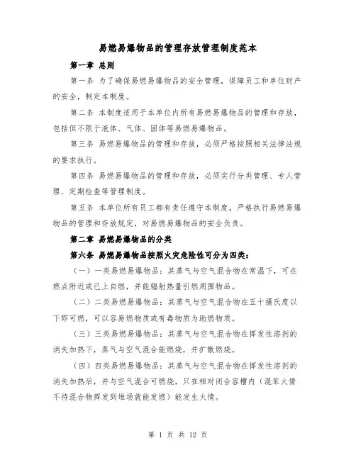 易燃易爆物品的管理存放管理制度范本第一章总则第一条为了确保易燃易爆物品的安全管理,保障员工和单位财产的安全,制定本制度。