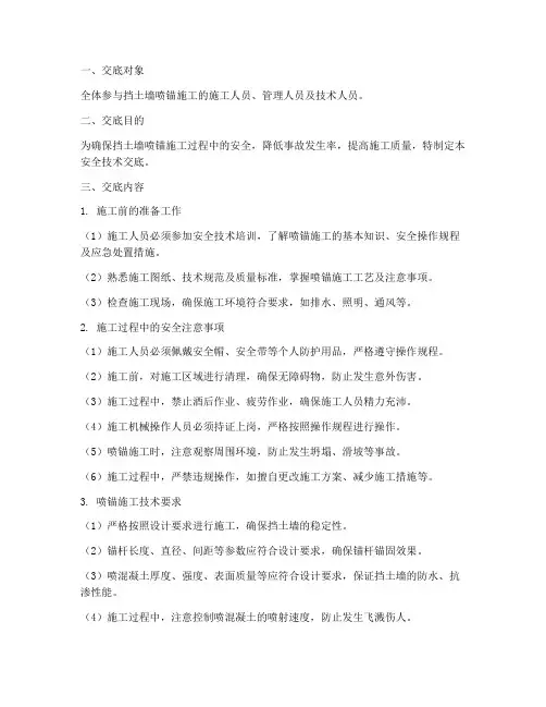 一、交底概述为确保基坑护坡喷锚施工过程中的安全,特制定本安全技术交底。