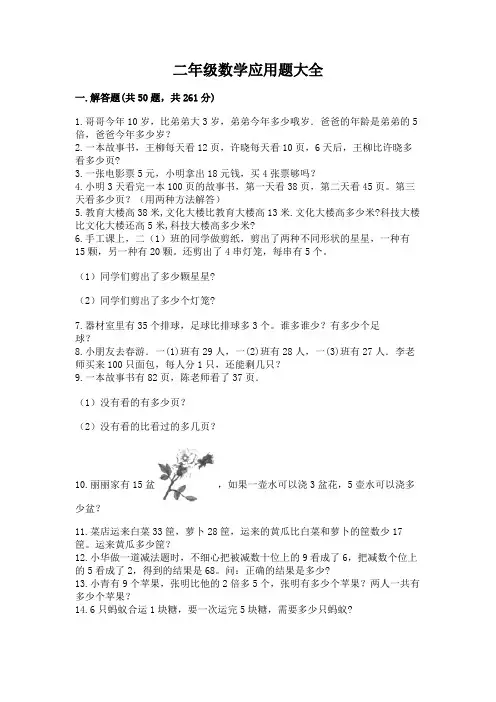 二年级数学应用题大全一.解答题(共50题,共261分)1.哥哥今年10岁,比弟弟大3岁,弟弟今年多少哦岁.爸爸的年龄是弟弟的5倍,爸爸今年多少岁?2.一本故事书,王柳每天看12页,许晓每天看10页,6天后,王柳比许晓多看多少页?3.一张电影票5元,小明拿出18元钱,买4张票够吗?4.小明3天看完一本100页的故事书,第一天看38页,第二天看45页。