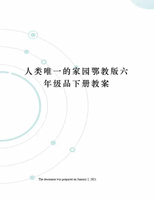人类唯一的家园鄂教版六年级品下册教案The document was prepared on January 2, 2021(鄂教版)六年级品德与社会下册教案第三单元只有一个地球第八课人类唯一的家园教学目标情感、态度与价值观:知道科学家正在为创造人类生活的另一个家园而做出努力,感受地球是目前人类生活的唯一家园。