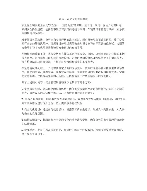 第一章总则第一条为加强客运公司安全管理,保障乘客和员工的生命财产安全,预防事故发生,根据《中华人民共和国道路交通安全法》、《中华人民共和国安全生产法》等相关法律法规,结合本公司实际情况,特制定本制度。