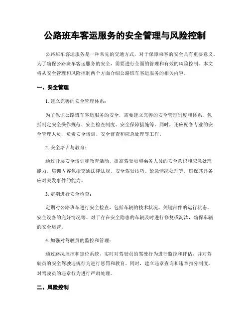 客运安全生产管理措施1、客运企业安全管理制度第一章总 则第一条 为了切实加强安全生产监督管理,保障客运行车安全和人民群众生命财产安全,防止和减少安全事故,根据国家和省、市、县有关规定,结合企业实际,制定本制度。