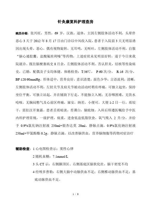 针灸康复科护理查房病历介绍:张兴旺,男性,69岁,汉族,退休,主因左侧肢体活动不利,头晕伴恶心3天于2012年8月17日由门诊以中风收入院,患者于入院前3天无明显诱因出现头晕,恶心,偶有视物旋转,无耳鸣,无呕吐,左侧肢体活动不利。