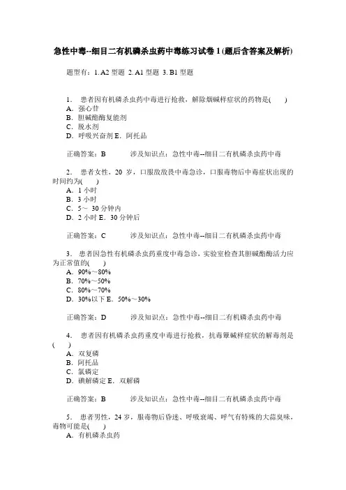 急性中毒试题及答案 Document number:NOCG-YUNOO-BUYTT-UU986-1986UT急性中毒考试试题姓名:________科室:________职业:________得分:______单选题:共20题,每题5分,总分100分1.重度有机磷中毒时,全血胆碱酯酶活力应为()A70%以下B60%以下C50%以下D40%以下E30%以下2.有机磷中毒所致急性肺水肿,抢救首选()A速尿B西地兰C阿托品D解磷定E吗啡3.有机磷杀虫药中毒的原理()A胆碱酯酶失活B磷酰化胆碱酯酶减少C胆碱酯酶活性增强D交感神经兴奋E肝功能受损4.急性有机磷农药中毒最主要的死因()A中毒性休克B急性肾功能衰竭C呼吸衰竭D中毒性心肌炎E脑水肿5.下列哪种有机磷农药中毒,从尿中可检测出硝基酚() A敌百虫B对硫磷C内服磷D马拉硫磷E甲拌磷6.诊断有机磷中毒最重要的指标是()A确切的接触史B出现毒蕈碱和烟碱样症状C血胆碱酯酶活性降低D阿托品试验诊断阳性E呕吐物和衣服有大蒜味7.有机磷中毒引起的毒蕈碱样症状是()A肌束颤动B流涎C血压升高D瞳孔缩小E休克8.病人突然昏迷、抽搐、瞳孔缩小、皮肤湿冷、多汗、呼吸困难,应考虑下列哪种疾病可能性大()ACO中毒B巴比妥类药物中毒C中暑D阿托品中毒E有机磷农药中毒9.急性有机磷农药中毒抢救治疗后,哪种农药可再发生昏迷或突然死亡()A内硫磷B对硫磷C乐果D敌敌畏E以上都不是10.关于有机磷的代谢和排泄正确的是()A在体内蓄积,毒性持久B经肾排泄C肝内氧化产物不如原来毒性强D肝内水样产物比原来毒性强E经皮肤、呼吸道吸收,不经胃肠道排泄11.下列哪个症状属于交感神经节后纤维的兴奋症状()A肌束颤动B流涎C多汗D呼吸肌麻痹E支气管痉挛12.有机磷中毒出现毒蕈碱样症状主要机制是()A腺体分泌亢进、运动神经兴奋B腺体分泌减退、平滑肌痉挛C腺体分泌亢进、平滑肌痉挛D腺体分泌亢进、平滑肌松弛E运动神经兴奋、平滑肌痉挛13.有机磷中毒,烟碱样症状是()A流涎B多汗C恶心、呕吐D肌纤维颤动E肺水肿14.急性有机磷中毒患者应用阿托品过量引起中毒时,解毒剂是() A依地强钠钙B毛果芸香碱C青霉胺D亚甲蓝E二巯基丙醇15.治疗有机磷中毒时,下列哪一项是错误的()A阿托品用量应根据中毒的程度适当掌握B出现阿托品化应减量,延长给药间隔时间C中度以上中毒,阿托品疗效差,可合用胆碱酯酶复活剂D阿托品与复活剂合用时,减少阿托品的用量E各种复活剂只选用一种即可16.中度敌百虫中毒患者,下列哪项不正确()A立即静注阿托品B立即用2%NaHCO3水10000ml彻底洗胃C及早用阿托品和双复磷D根据病情和治疗反应调整药物剂量E缓解后观察3~5天,注意病情变化17.解磷定和氯磷定对哪种有机磷中毒疗效差()A内吸磷B对硫磷C甲胺磷D甲拌磷E敌百虫18.男性,20岁,误服有机磷农药,瞳孔缩小、面肌颤动、呼吸有大蒜味,最好选用哪种溶液来洗胃()A1∶5000高锰酸钾液B硫酸酮溶液CNaHCO3水D生理盐水E清水19.确诊CO中毒最主要的依据是()A空气中CO的浓度B与CO接触的时间C血液中碳氧血红蛋白的有无D昏迷的深度E缺氧的程度20.女性,28岁,被人发现昏迷且休克,屋内有火炉,且发现有敌敌畏空瓶。