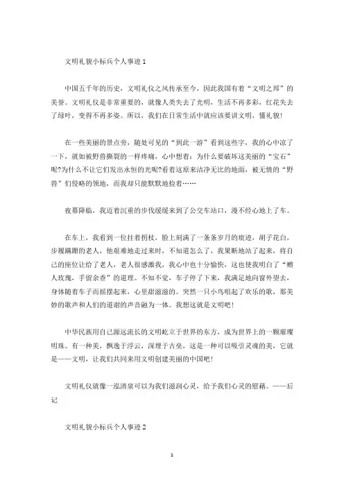 文明礼仪小标兵事迹材料范文(二)作为学校大队委的她,兴趣爱好广泛,是学校礼仪队和国旗班的成员,本年度的市级三好学生。