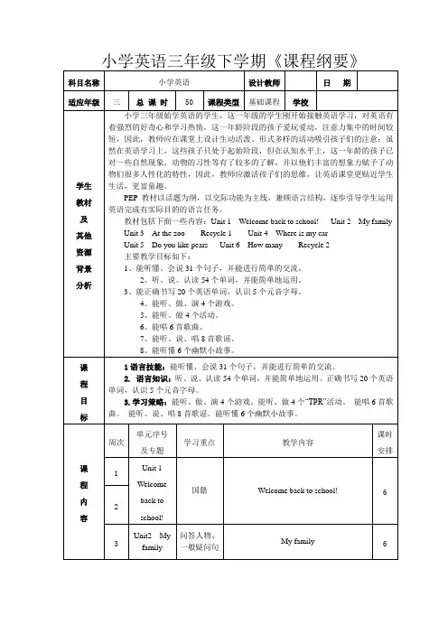 三年级英语下册课程纲要科目名称:小学英语课程类型:基础型课程教学材料:人民教育出版社义务教育课程标准实验教科书英语PEP三年级下册授课时间:42课时授课教师:英语备课组授课对象:三年级一、课程目标:1、培养学生对英语有好奇心,喜欢听他人说英语。