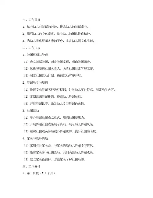 二、工作内容1. 社团组建与报名(1)制定舞蹈社团招生简章,明确招生对象、时间、地点等。