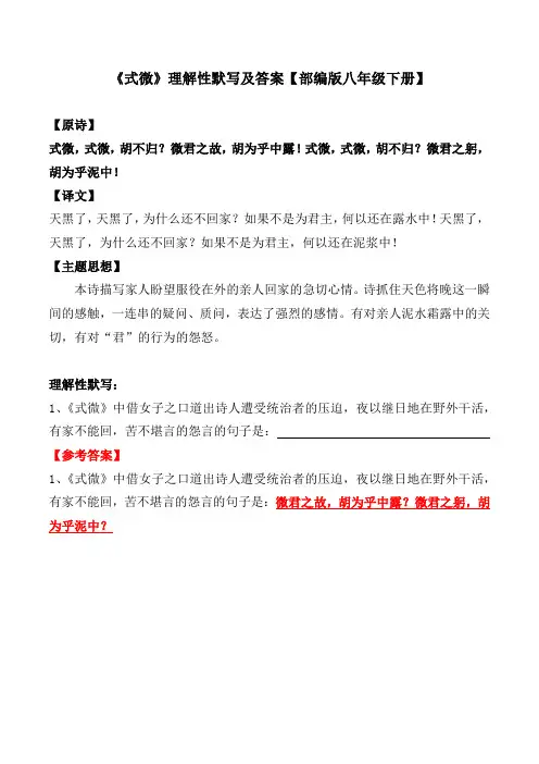 《式微、子衿》习题及答案【部编版八下】题型:【理解性默写】【简答题】一、《式微》【原诗】式微,式微,胡不归?微君之故,胡为乎中露!式微,式微,胡不归?微君之躬,胡为乎泥中!【译文】天黑了,天黑了,为什么还不回家?如果不是为君主,何以还在露水中!天黑了,天黑了,为什么还不回家?如果不是为君主,何以还在泥浆中!【主题思想】本诗描写家人盼望服役在外的亲人回家的急切心情。