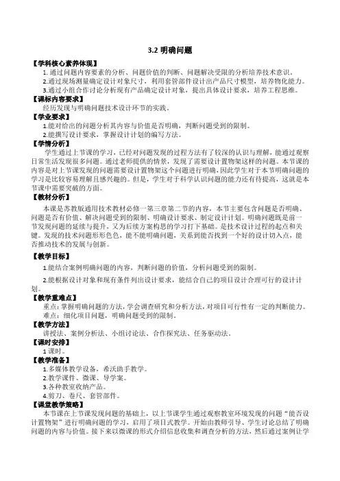 第四章发现与明确问题(苏教版)第二节明确问题(教案)一、教材内容分析这节内容是本书第四章第二节的内容,是发现问题基础上展开的,它由“明确问题与价值,明确解决问题受到的限制及具体的设计任务、设计计划”三部分组成,分为2课时完成。