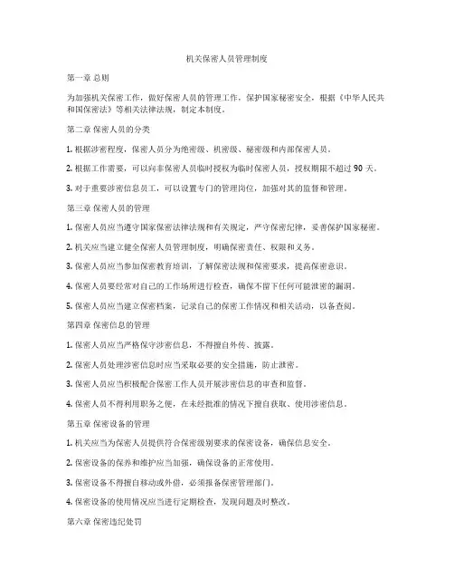机关保密人员管理制度第一章总则为加强机关保密工作,做好保密人员的管理工作,保护国家秘密安全,根据《中华人民共和国保密法》等相关法律法规,制定本制度。