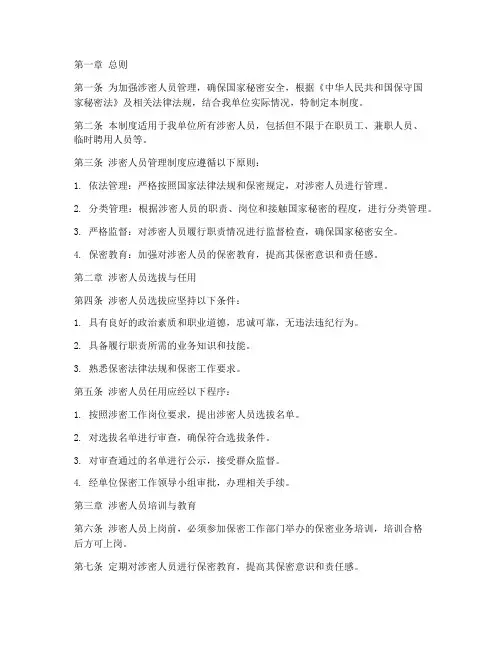 第一章总则第一条为加强涉密人员管理,确保国家秘密安全,根据《中华人民共和国保守国家秘密法》及相关法律法规,结合我单位实际情况,特制定本制度。