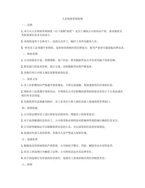 保密人员的管理制度第一章总则第一条为了加强对保密工作的管理,确保国家秘密安全,依照《中华人民共和国保守国家秘密法》的规定,制定本制度。