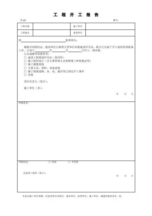 二、停工程序1. 施工单位发现停工原因时,应立即停止施工,并向工程项目负责人报告;2. 工程项目负责人应在接到报告后1小时内,向有关政府部门报告,并提交停工申请;3. 政府部门应在接到申请后2小时内,对申请进行审查,并作出是否同意停工的决定;4. 同意停工的,政府部门应向施工单位发出停工通知书,并监督执行;5. 施工单位应按照停工通知书要求,停止施工,并进行整改;6. 整改完成后,施工单位向政府部门申请复工,经审查合格后,方可恢复施工。