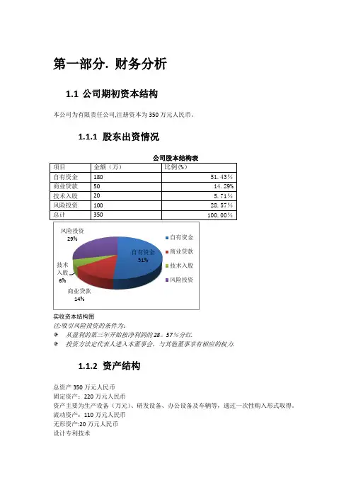 第一部分. 财务分析1.1 公司期初资本结构本公司为有限责任公司,注册资本为350万元人民币。