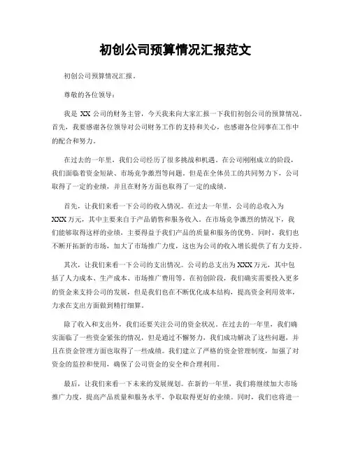 尊敬的各位领导:我是XX公司的财务主管,今天我来向大家汇报一下我们初创公司的预算情况。